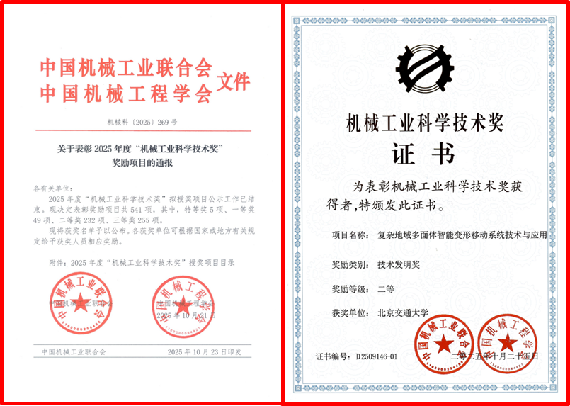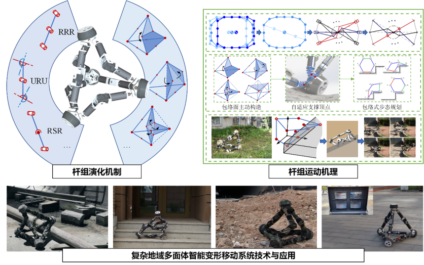项目简介:项目聚焦新原理、新形态、新方法赋能陆域无人系统,针对多维度空间、大尺度障碍、非结构地形等复杂环境探测、救援需求,突破轮、履、足及复合式移动系统的传统构型,面向移动变形动态耦合的关键科学问题,建立了独辟蹊径的整体变形式多面体移动系统理论体系:首创整体变形式多面体移动系统创成理论,提出了基于顶“点”-轴“线”-环“面”-变“体”图论范式的多面体移动系统创新概念,形成了强适应性多模式变体移动技术,发明了多顶点协同智能环境交互技术,并攻克了图像视角融合、异构模态融合与变形移动融合的关键技术难题。项目获发明专利23项,软件著作权6项,在Mechanism and Machine Theory、IEEE Transactions on Intelligent Transportation Systems、International Conference on Robotics and Automation等国内外顶级期刊、会议发表高水平论文68篇,经鉴定委员会评价“非连续陡坡攀爬角、最大折展比、越障高质心高比、速度身长比等关键技术指标达到了国际领先。”